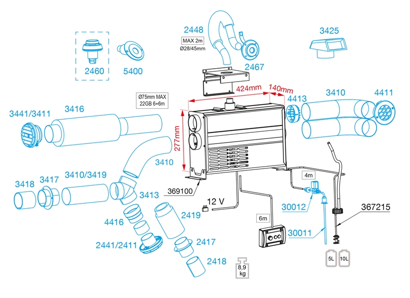 Varmerpakken inkluderer: Varmeren, kontrollpanel, festebrakett, 4 m drivstoffslange, dieselfilter, 4 m strømkabel og sikringsholder med 15A sikring.