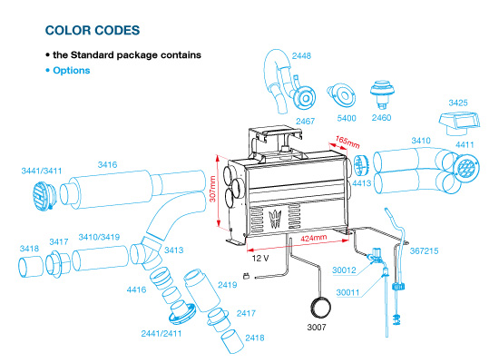 Varmepakken inkluderer: Varmeren, kontrollpanel, festebrakett, 4 m drivstoffslange, dieselfilter, 4 m strømkabel og sikringsholder med sikring.