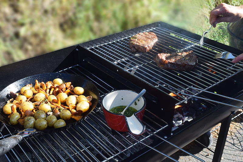En åpen grill som tønnegrill Odis egner seg best til pølser og kjøtt i skiver. Skal du grille hele steker og fileter bør du ha en grill med lokk, for eksempek kulegrill Freda. Det reduserer også faren for at maten brennes. Det bør være mulighet til å regulere avstanden mellom grillristen og glørne.