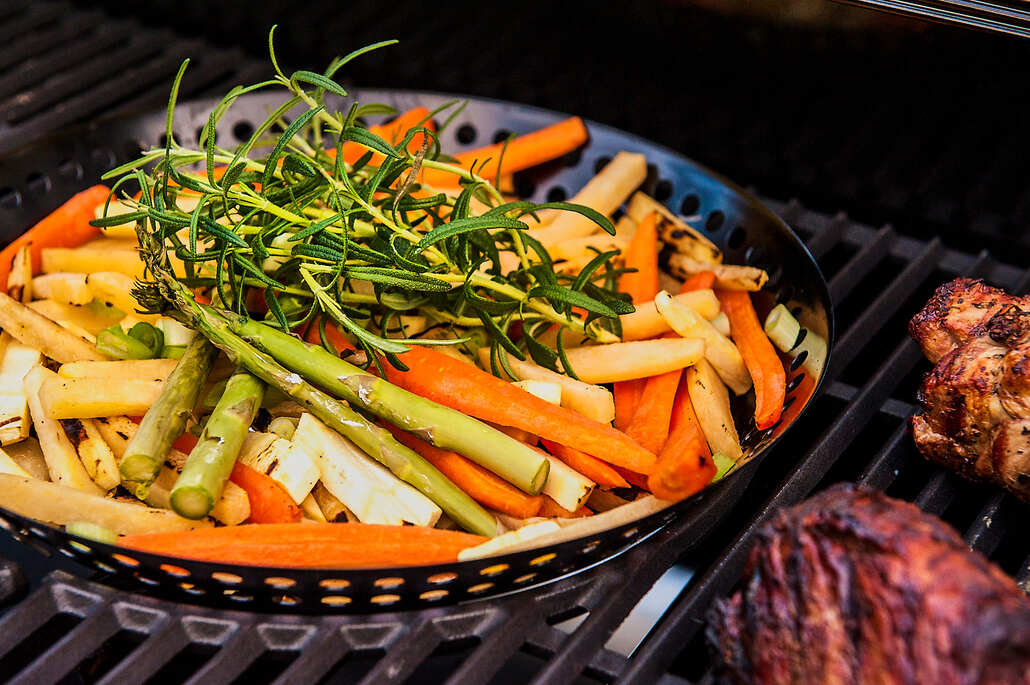 Tips: for å gi grønnsakene det lekre, grillede preget kan de grilles de siste minuttene på grillrist over direkte varme. Hold et godt øye med grønnsakene, og snu jevnlig. Dette fungerer best når grønnsakene er kuttet i relativt store, tykke staver.