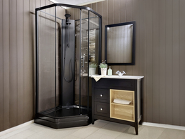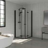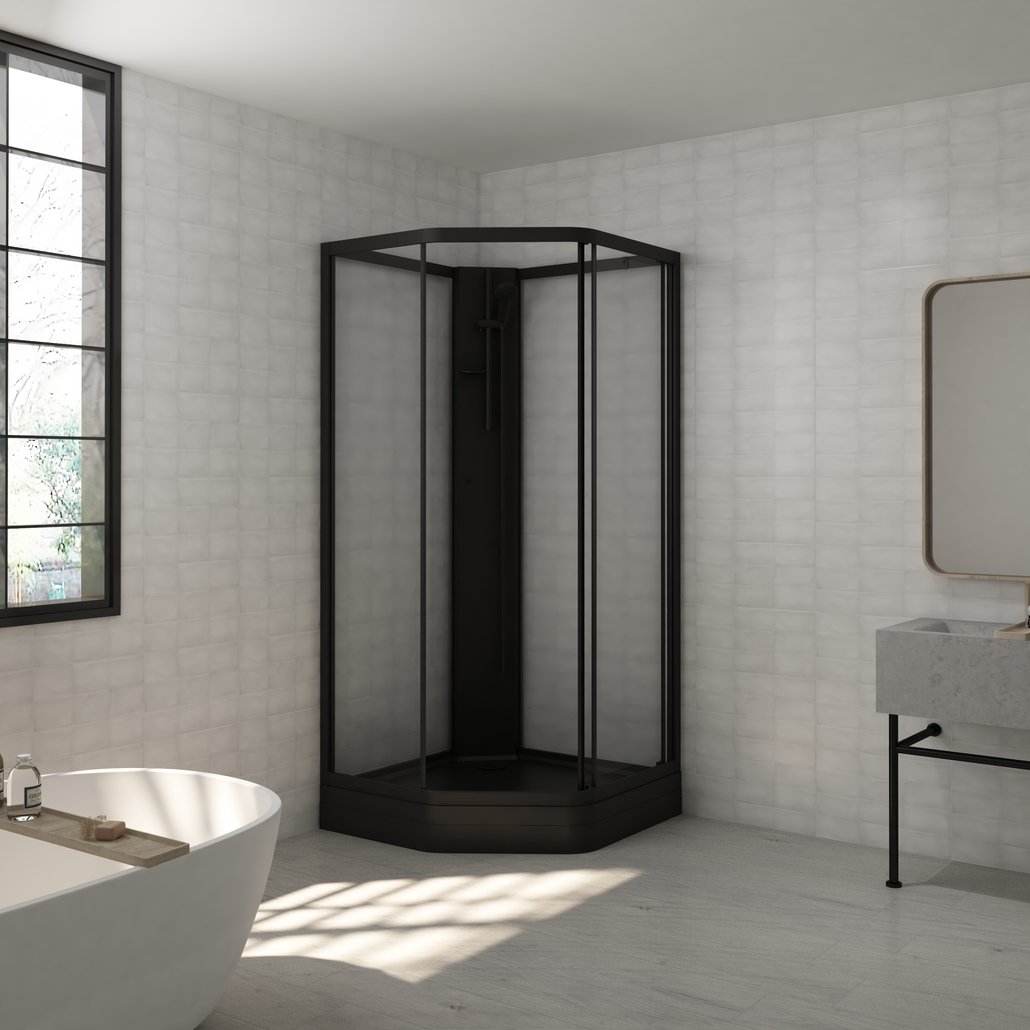 Dusjkabinett Aurora Black - 80 x 80 x 195 cm har bak- og frontvegger i 6 mm herdet, klart glass. Den lavere totalhøyden er perfekt for hytter med lavere takhøyde