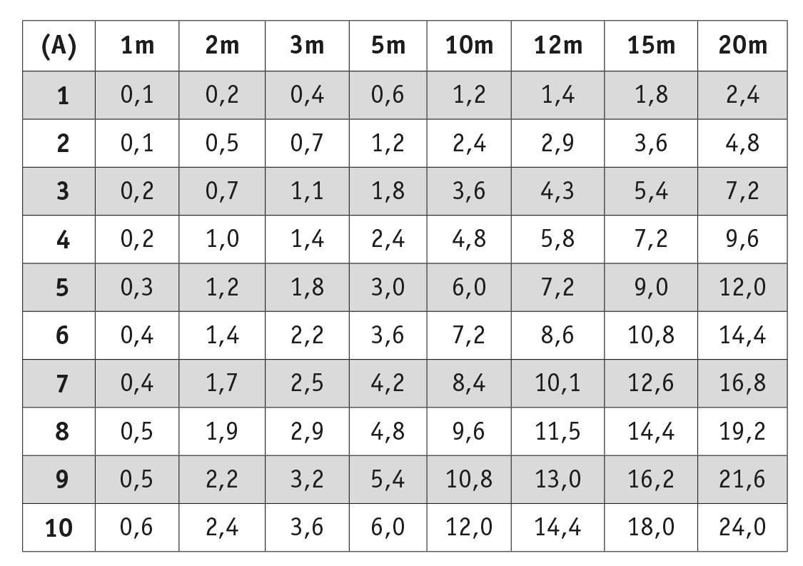 För en bra beräkning av arean kan du använda tabellen nedan för att beräkna kabelarean. Tabellen ger 2,5% effekt och spänningsförlust. Om du halverar kabelarean ökar tappet till 5%.